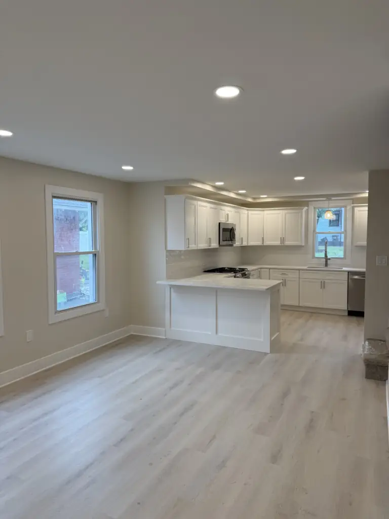 Brand new kitchen remodeling with island, lights, and stainless appliances.